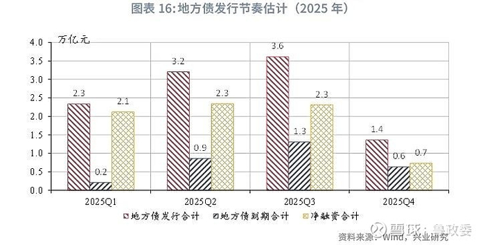 从供给节奏来看,2025年政府债发行量、净融资规模在第二、三季度较大,政府债发行量分别约7.0万亿元、7.8万亿元;净融资规模分别约4.2万亿元、4.6万亿元。国债方面,预计节奏相对后置,发行量在第四季度达到高峰,净融资规模在第三季度达到高峰;地方债方面,预计再融资地方债发行靠前,全部地方债净融资在第二、三季度规模较高。