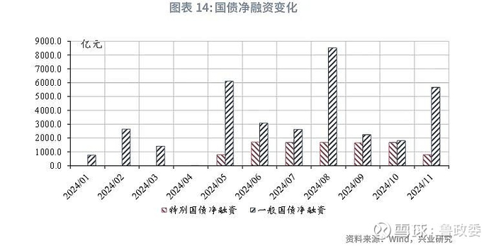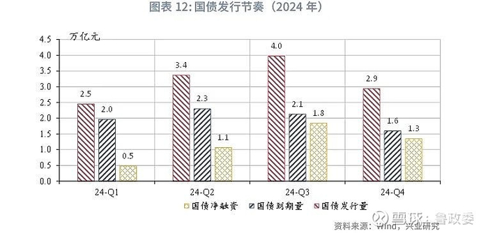 回顾2024年国债发行节奏,截至2024年11月末,当年国债增量额度已发行完毕,假设国债使用结存额度4000亿元,则2024年全年发行规模预计12.7万亿元,净融资规模在第三、四季度达到高峰,发行节奏相对后置。