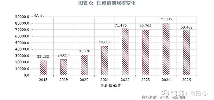 再融资方面,2025年,以往年份发行的国债到期规模约为6.9万亿元;假设2025年贴现国债的发行规模为3.0万亿元,贴现国债的年内到期比例50%,由此年内到期的贴现国债发行规模约为1.5万亿元,国债到期规模共计约8.4万亿元。