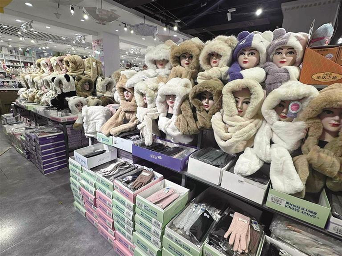 帽子、围脖、手套作为冬季必不可少的保暖三件套,在兰州市各大商超街铺内上架,渔夫帽、盆帽、三件连体帽等花式帽子在店内最明显的位置摆放,以“属于你的温暖搭子”“从‘绒’过冬整个暖住”等为主题亮相,其中三件连体帽套装最受欢迎。走进华邦饰品城,款式多样的棉帽吸引不少女士进店试戴选购。“目前店内销售最好的是棉帽等保暖类物品,预定的人从上周开始明显增多,销量比刚入冬时增长30%。”一家综合饰品专卖店老板傅先生介绍。