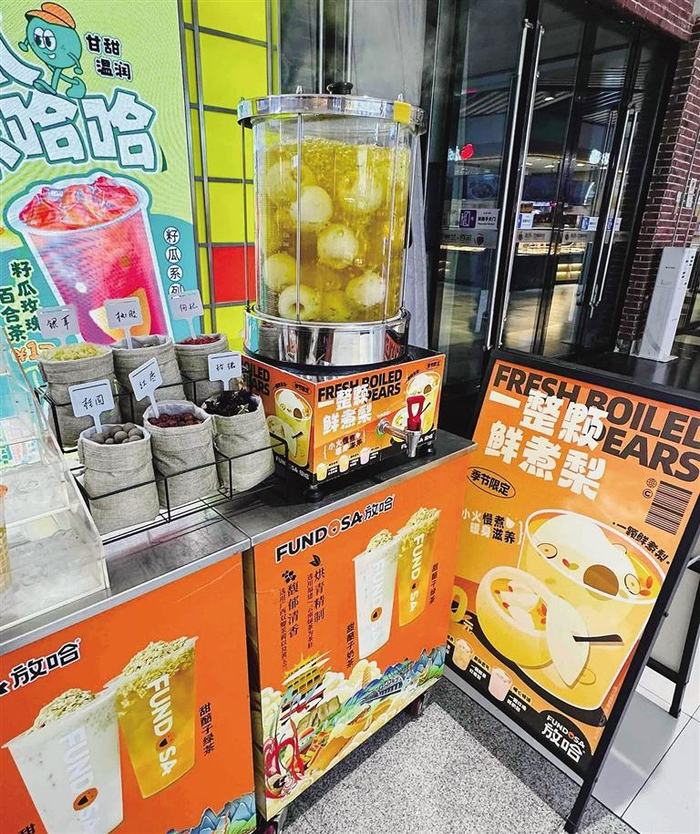 外部暖身,内部暖胃,养生茶在这个冬季也迎来销售旺季。在兰州中心放哈饮品店门口,多个已经被削皮去核的梨被装进在透明的容器里熬煮,旁边分别摆放有玫瑰、枸杞、红枣、银耳、桂圆等食材。这是放哈在今冬新推出的“一整颗鲜煮梨”冬季饮品,通过小火慢煮,加入不同食材,让食客暖身又滋养。