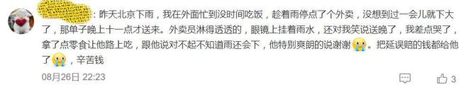 而且,还有一个颇为难能可贵的现象,一旦遇到暴雨台风大雪等恶劣天气,骑手送单晚了等情况,绝大多数消费者都是会表示包容与理解,甚至还有一些好心的消费者会主动打赏这些"迟到"的骑手,让骑手也会感受到来自社会的浓浓善意与温暖!