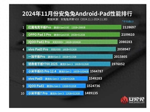 近日,知名手机性能评测软件安兔兔公布了11月最强安卓平板TOP10榜单,为众多关注平板性能的消费者提供了权威参考。本次榜单中,专为游戏场景设计的红魔电竞平板Pro凭借其卓越的性能表现,成功夺得Pad性能榜榜首。