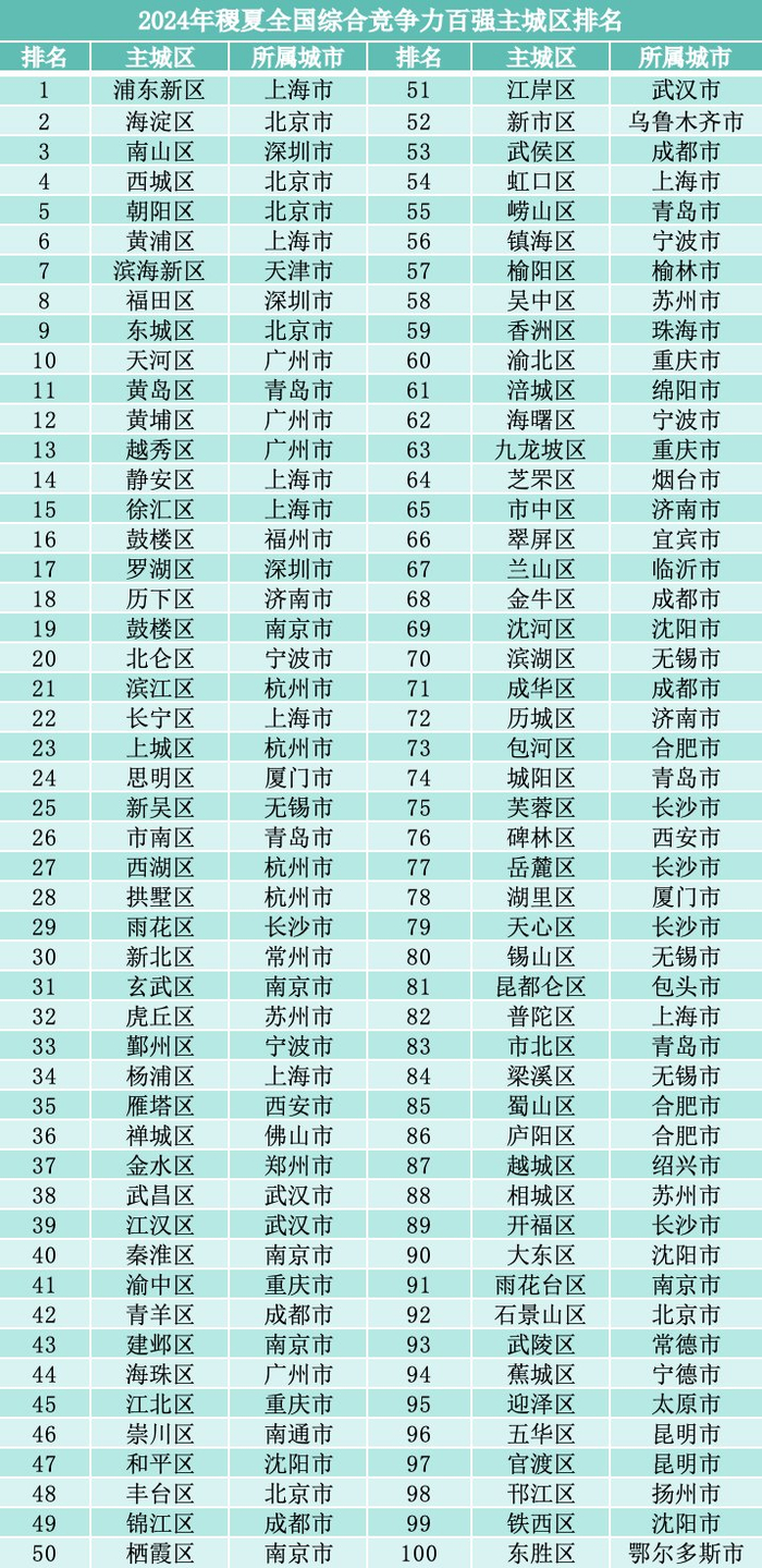 2024年全国百强主城区前10位分别是上海浦东新区、北京海淀区、深圳南山区、北京西城区、北京朝阳区、上海黄浦区、天津滨海新区、深圳福田区、北京东城区、广州天河区。前10强主城区大都属于一线城市,与上年相比,上海黄浦区和深圳福田区名次对调;广州黄埔区掉出前十,天河区“补位”成为第10名。