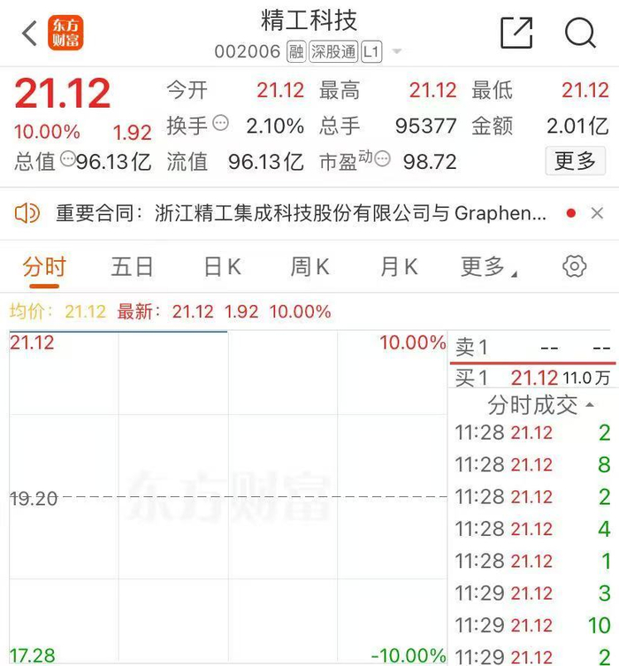 12月3日早盘,精工科技(SZ002006)一字涨停。截至3日上午收盘,该股报21.12元,涨停板封单11.00万手,成交额2.014亿元。