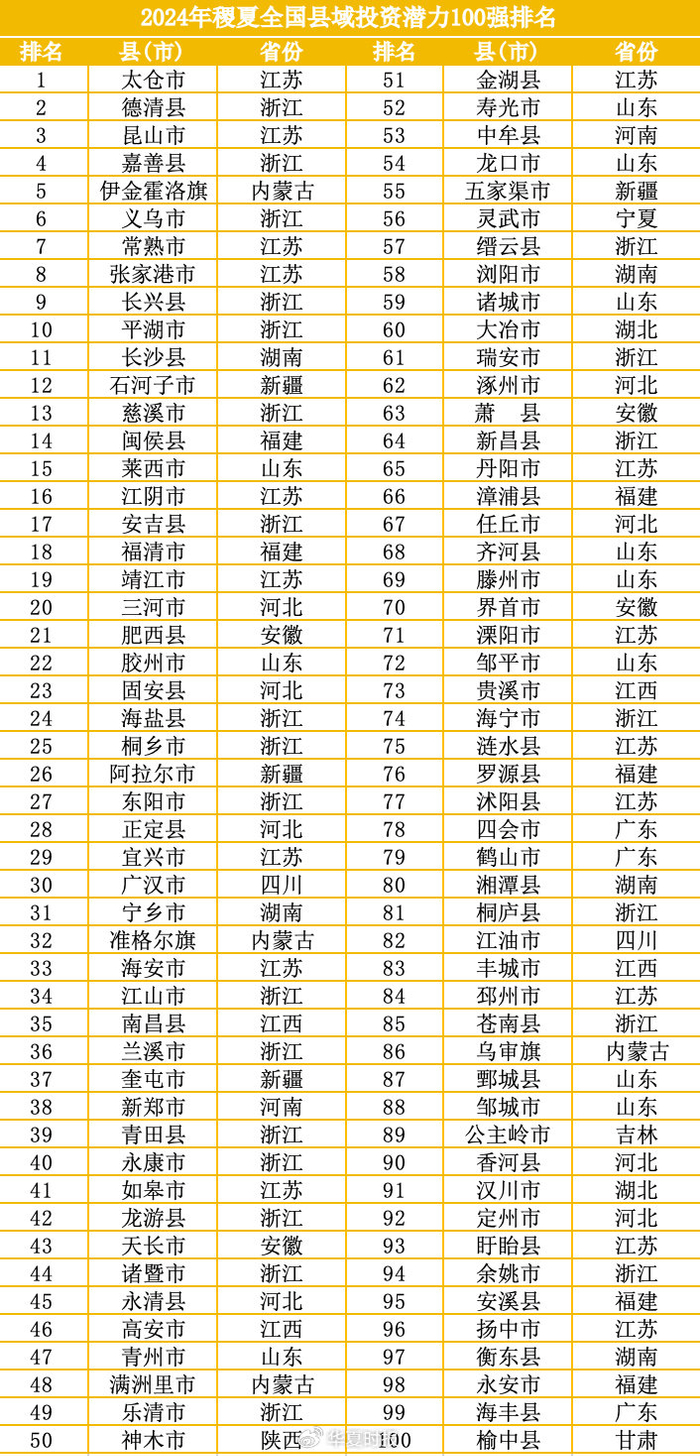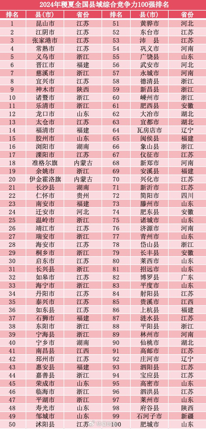 《华夏时报》受权发布2024年全国县域经济综合竞争力100强县(市)排名: