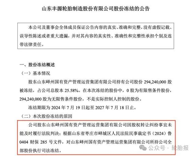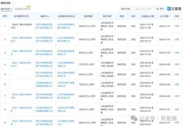 在股权结构方面,丰源轮胎的主要股东包括枣庄矿业集团有限责任公司、山东峄州国有资产管理运营集团有限公司(以下简称“峄州国资集团”)和丰源集团,持股比例分别为60.50%、25.58%和13.92%。然而,峄州国资集团的股权状况存在不确定性。据企查查信息,峄州国资集团持有的丰源轮胎股权在2023年内已被司法冻结三次,且公司尚未就最近一次冻结发布公告。