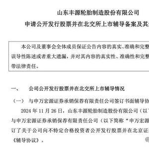 山东丰源轮胎制造股份有限公司(以下简称“丰源轮胎”)近日宣布,已于11月26日与申万宏源证券承销保荐有限责任公司签订《辅导协议》,准备向不特定合格投资者公开发行股票,并计划在北京证券交易所上市。