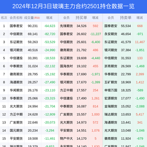 新浪期货 根据交易所数据,截至12月03日收盘主力合约玻璃2501,涨跌+0.00%,成交量54.25万手,持仓数据显示前20席位呈现净空,差额头寸为82047手。