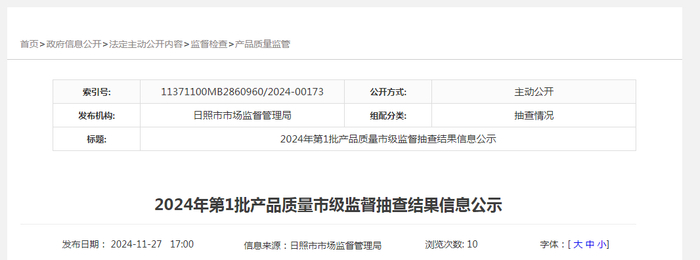 山东省日照市市场监督管理局公示2024年第1批产品质量市级监督抽查结果