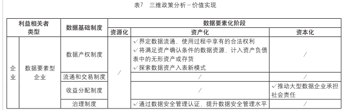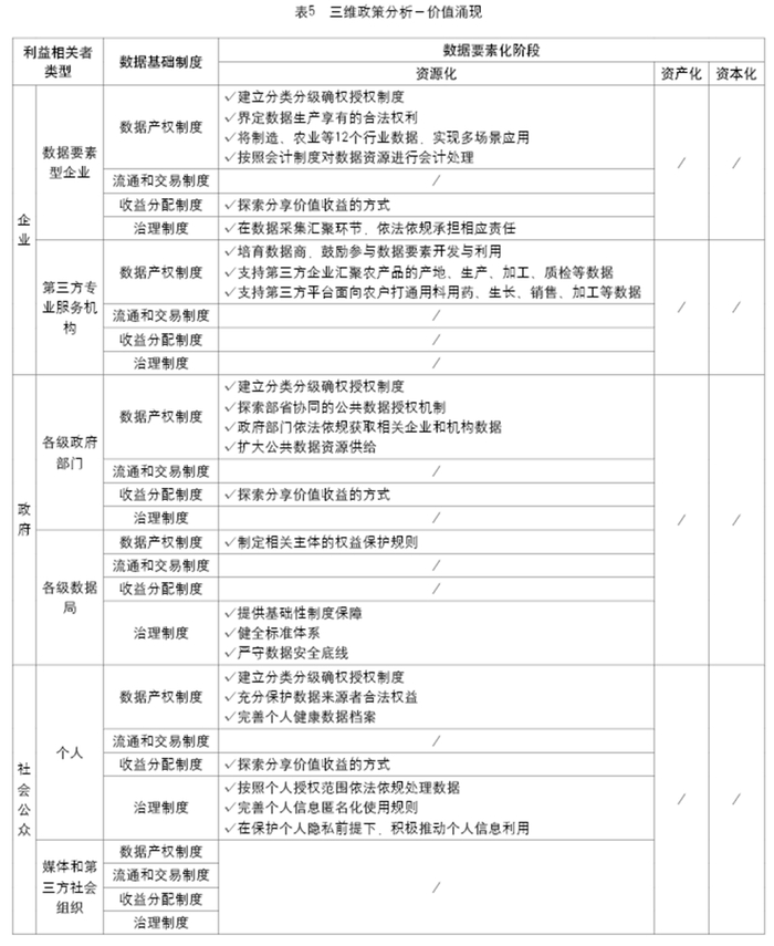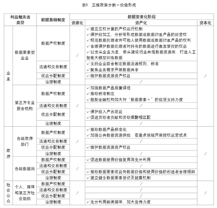通过对被选择的2个政策案例进行编码,分析中共中央、国务院、国家数据局等设计、制定的数据基础制度及配套政策,在数据要素资源化、数据资产化、数据资本化三个阶段中,对数据要素市场培育不同类型利益相关者的引导与作用。再从数据要素价值链的价值涌现、价值形成、价值实现三个环节出发,分别对“数据要素市场的利益相关者-数据基础制度-数据要素化阶段”的三维政策展开分析(参见表5、表6与表7)。