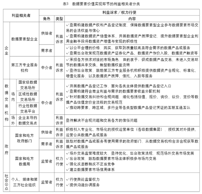 数据要素价值实现环节主要是将种类繁多的数据产品通过资产评估、风险评估、合规认证、数据公证、数据保险等环节,经由数据交易场所交易,实现数据产品转化成可货币化衡量的数据资产的过程;再以数据资产为基础,开展数据资产融资、数据资产证券化,进而实现数据要素资本化的过程。这一环节让数据要素不仅具有使用价值,还产生了交换与金融价值。这个环节涉及的利益相关者,包括拥有企业数据产品、使用数据产品的数据要素型企业(企业);提供数据资产相关服务的第三方专业服务机构(企业);提供数据交易场所的数据交易机构(数据交易机构);拥有公共数据产品、使用数据产品的国家和地方政府部门(政府);行使监督权力的国家和地方数据局(政府);行使舆论监督权力的媒体和提供沟通协调服务的第三方社会组织(社会公众)(参见表3)。
