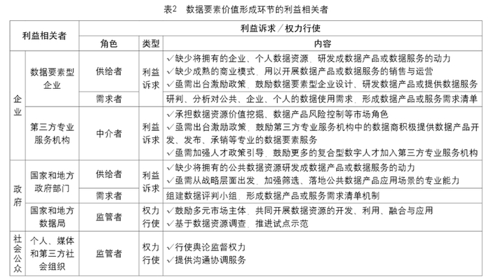 数据要素价值形成环节主要是将具有潜在价值的公共、企业、个人数据资源,与丰富的实际应用场景深度融合,通过数据的脱敏、算法模型的训练、生成式人工智能的运用等步骤,产生大量且具有高价值数据产品的过程。这个环节涉及的利益相关者,包括拥有企业、个人数据资源,使用数据资源的数据要素型企业(企业);提供数据产品开发、发布、承销的第三方专业服务机构(企业);拥有公共数据资源、使用数据资源的国家和地方政府部门(政府);行使监督权力的国家和地方数据局(政府);行使舆论监督权力的媒体和提供沟通协调服务的第三方社会组织(社会公众)(参见表2)。