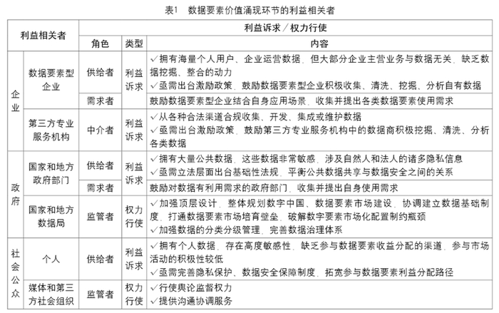 数据要素价值涌现环节主要是将海量且散落的公共、企业、个人数据,经过数据收集、数据清洗、数据挖掘、数据分析等步骤,转变成具有潜在价值的数据资源的过程。这个环节涉及的利益相关者,包括拥有企业、个人数据,使用数据的数据要素型企业(企业);提供数据汇总、清洗、加工、分析、治理等服务的第三方专业服务机构(企业);拥有公共数据、使用数据的国家和地方政府部门(政府);拥有个人数据的个人(社会公众);行使监督管理权力的国家和地方数据局(政府);行使舆论监督权力的媒体和提供沟通协调服务的第三方社会组织(社会公众)(参见表1)。