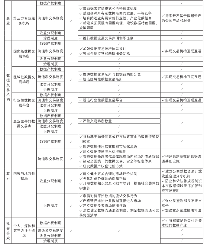数据要素市场中的企业,可分为数据要素型企业与第三方专业服务机构。数据要素型企业一般是指拥有大量有价值企业、个人数据或将数据加工成可以交易的数据产品,且对数据要素定价有话语权的一类企业。如上海钢联、航天宏图、科大讯飞等。国际上,数据要素型企业发生的多次并购行为,都是以获取目标公司的数据资源和提升数据分析能力为目的,如亚马逊、eBay和谷歌等。从案例分析来看,针对数据要素型企业的政策贯穿于数据要素化三个阶段。在数据要素资源化阶段,通过多种利益共享方式,鼓励数据要素型企业加强企业数据供给。在数据要素资产化阶段,通过保护经营权、许可权等,鼓励数据要素型企业参与数据要素市场流通与交易。但2份政策文件中关于鼓励数据要素型企业进场交易、参与场外交易的措施以及关于数据产品估值和定价的相关措施相对缺乏。在数据要素资本化阶段,鼓励大型数据企业积极承担社会责任,同时通过反垄断,规避企业垄断及不正当竞争行为。第三方专业服务机构一般是指为参与数据要素市场的供需双方,提供数据经纪、合规认证、风险评估、人才培训等服务的第三方专业机构,包括数据商、数据流通交易第三方服务机构。第三方专业服务机构不仅能够降低数据产品的生产成本,还能提高数据价值、提升价值实现效率,为数据要素供给者、需求者节省数据要素流通交易成本。从案例分析来看,针对第三方专业服务机构的政策集中于数据要素资产化阶段。在数据要素资产化阶段,鼓励第三方专业服务机构围绕数据质量评估、数据权属确定和数据资产定价等,开展标准界定、范畴讨论等工作。