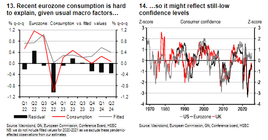 借助计量经济学模型,汇丰认为“欧洲大陆的节俭”主要源于:高利率、家庭财富减少和信心低迷三个因素。