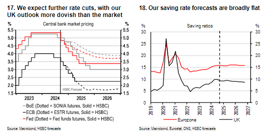 信心疲弱主要来自两方面。汇丰认为,一是能源短缺后给欧洲家庭带来的“创伤”效应,为了防止后续能源价格的可能波动,家庭会持续寻求更大程度的储蓄缓冲;二是欧洲地区面临来自德国、法国、英国三方的政治不确定性,还面临来自美国下一届政府前景的不确定性。