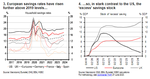 汇丰的报告表示,“欧洲大陆的节俭(continental thrift)”这一现象出现在新冠疫情结束后,彼时欧洲家庭的储蓄率显著较高,而美国家庭的储蓄率则相对更低。