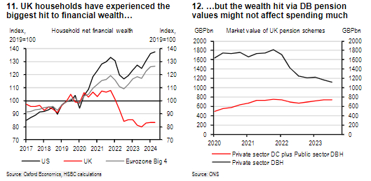 家庭财富减少方面,报告称,主要是因为利率上升后债券价格下跌,导致固定福利(DB)养老金估值下降推动的,不过报告预计这对实际消费的负面影响不会太大。