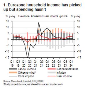 Hare进一步表示,目前欧元区及英国居民的实际收入同比增速已经超过3%,但家庭支出增速几乎零增长,主要可能是受到以下三个因素的拖累:一是高利率环境,二是居民财富减少,三是消费信心低迷。