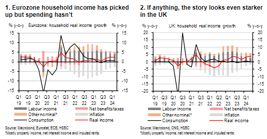 目前,这一现象没有缓和反而加剧,因为随着欧洲居民收入增长和通胀稳步降温,家庭支出的增速仍与此前持平甚至放缓,这一现象在英国尤为显著。