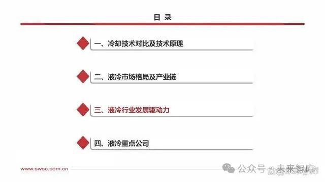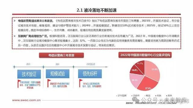 电信运营商提出液冷三年愿景。《电信运营商液冷技术白皮书》指出了电信运营商在液冷方面的三年愿景,2023年,开展技术验证,充分验 证液冷技术性能,储备规划、建设与维护等技术能力;2024年,开展规模测试,新建项目10%试点液冷技术;2025年,保证50%以上项目 规模应用,推进形成标准统一、生态完善、成本最优、规模应用的高质量发展格局。