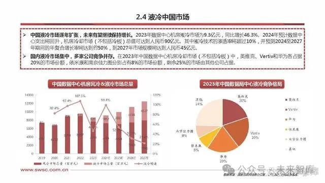 中国液冷市场逐年扩张,未来有望继续保持增长。2023年数据中心机房液冷市场为9.3亿元,同比增长46.3%。2024年预计数据中 心支出将回升,机房冷却市场(不包括冷板)总值可达到人民币90亿元。其中液冷技术的渗透率将超过10%,并预测2024至2027 年期间的年复合增长率将达到约50%,到2027年市场规模将达到人民币45亿元。 国内液冷市场集中,多家公司竞争并存。在2023年中国数据中心机房冷却市场(不包括冷板)中,英维克、Vertiv和华为各占据 20%的市场份额,依米康和南京佳力图分别占有8%的市场份额,剩余25%的市场由其他公司占据。