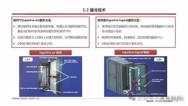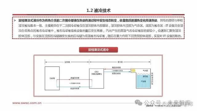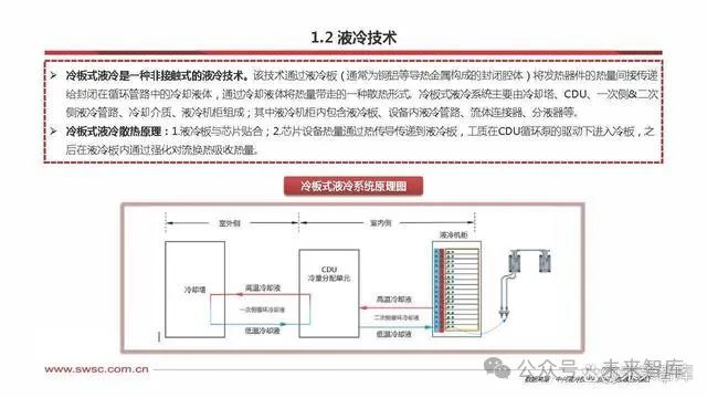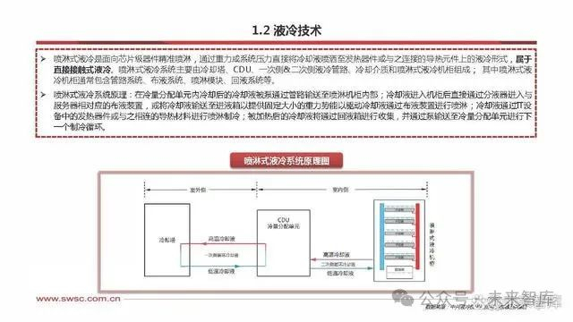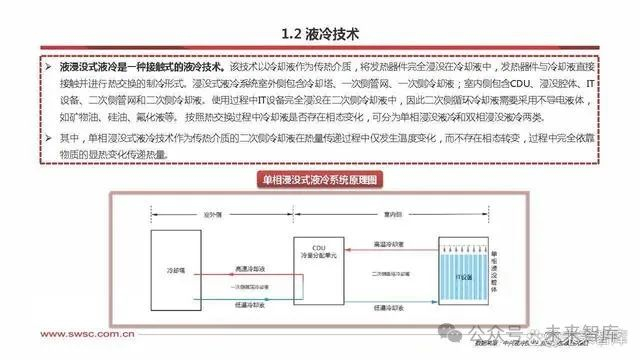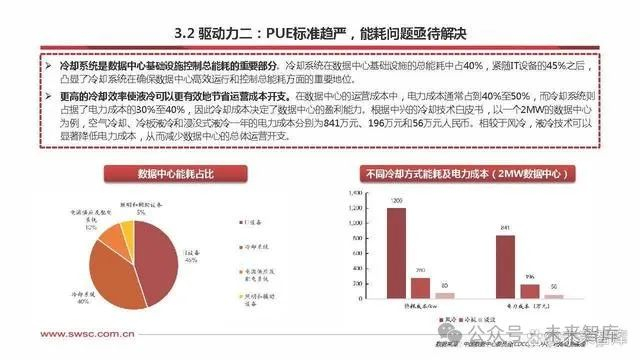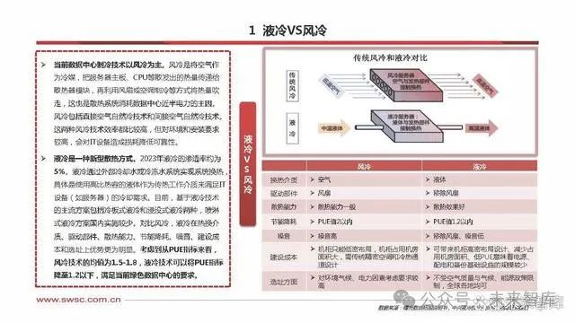 液冷是一种新型散热方式。2023年液冷的渗透率约为 5%。液冷通过外部冷却水或冷冻水系统实现系统换热, 具体是使用高比热容的液体作为传热工作介质来满足IT 设备(如服务器)的冷却需求。目前,基于液冷技术 的主流方案包括冷板式液冷和浸没式液冷两种,喷淋 式液冷方案国内实施较少。对比风冷,液冷在热换介质、驱动部件、散热能力、节能降耗、噪音、建设成 本和选址上优势更为明显。考虑到从PUE指标来看, 风冷技术的均值为1.5-1.8,液冷技术可以将PUE指标 降至1.2以下,满足当前绿色数据中心的要求。