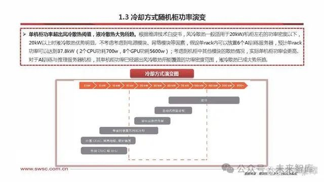 单机柜功率超出风冷散热阈值,液冷散热大势所趋。根据维谛技术白皮书,风冷散热一般适用于20kW/机柜左右的功率密度以下, 20kW以上时液冷散热优势明显。不考虑考虑到电源模块、网络模块等因素,假设单rack内可以放置6个AI训练服务器,预计单rack 功率可以达到37.8kW(2个CPU功耗700w,8个GPU功耗5600w);考虑到机柜中其他模块的散热情况,实际单机柜功率会更高。 对于AI训练与推理服务器机柜,其单机柜功率已经超出风冷散热所能覆盖的功率密度范围,液冷散热已成大势所趋。