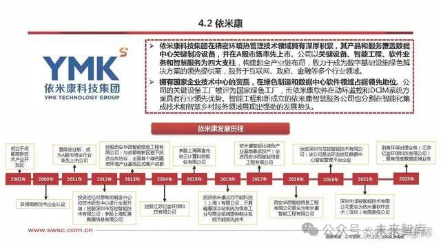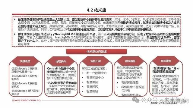 依米康科技集团在精密环境热管理技术领域具有深厚积累,其产品和服务覆盖数据 中心关键制冷设备,并在A股市场率先上市。公司以关键设备、智能工程、软件业 务和智慧服务为四大支柱,构建起全产业链布局,致力于成为数字基础设施绿色解 决方案的领先提供商,服务于互联网、政府、金融等多个行业领域。 拥有国家企业技术中心的资质,在绿色制造和数据中心软件领域占据领先地位。公 司的关键设备工厂被评为国家绿色工厂,而依米康软件在动环监控和DCIM系统方 面具有行业领先优势。智能工程和新成立的依米康智慧服务公司也分别在智能化集 成技术和智慧乡村服务领域展现出强劲的发展势头。