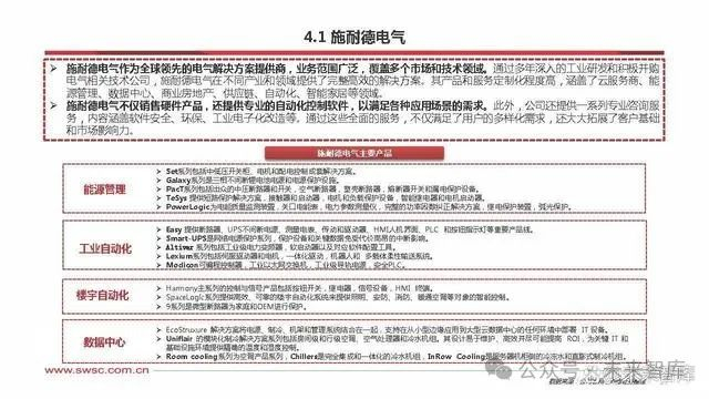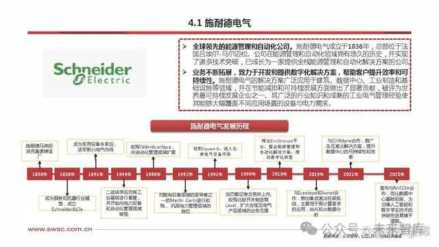 全球领先的能源管理和自动化公司。施耐德电气成立于1836年,总部位于法 国吕埃尔-马尔迈松。公司在能源管理和自动化领域拥有悠久的历史,并实现 了诸多技术突破,已成长为一家提供全栈能源管理和自动化解决方案的公司。 业务不断拓展,致力于开发和提供数字化解决方案,帮助客户提升效率和可 持续性。施耐德电气的解决方案广泛应用于建筑、数据中心、工业制造和基 础设施等领域,并在节能减排和可持续发展方面做出了显著贡献,被评为世 界最可持续发展企业之一。其广泛的行业知识和成熟的工业电气管理经验使 其能够大幅覆盖不同应用场景的设备与电力需求。