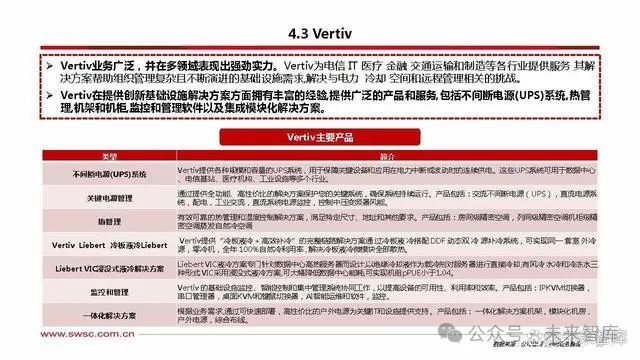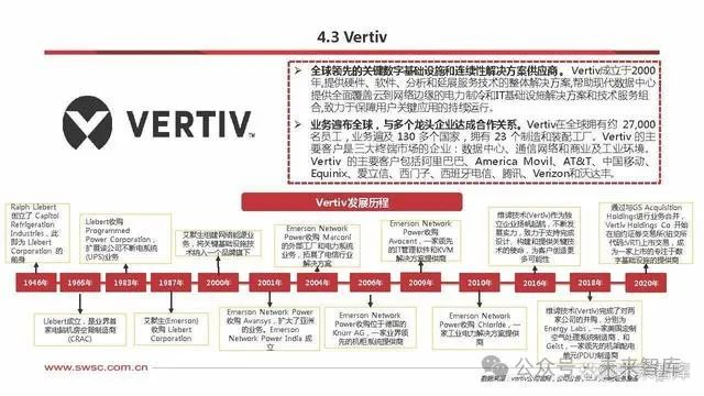 全球领先的关键数字基础设施和连续性解决方案供应商。Vertiv成立于2000 年,提供硬件、软件、分析和延展服务技术的整体解决方案,帮助现代数据中心; 提供全面覆盖云到网络边缘的电力制冷和IT基础设施解决方案和技术服务组 合,致力于保障用户关键应用的持续运行。 业务遍布全球,与多个龙头企业达成合作关系。Vertiv在全球拥有约 27,000 名员工,业务遍及 130 多个国家,拥有 23 个制造和装配工厂。Vertiv 的主 要客户是三大终端市场的企业:数据中心、通信网络和商业及工业环境。 Vertiv 的主要客户包括阿里巴巴、America Movil、AT&T、中国移动、 Equinix、爱立信、西门子、西班牙电信、腾讯、Verizon和沃达丰。
