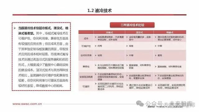 当前液冷技术包括冷板式、浸没式、喷 淋式等类型。其中,冷板式液冷技术在 可维护性、空间利用率、兼容性方面具 有较强的应用优势;但在成本方面,由 于其单独定制冷板装置的原因,导致技 术应用的成本相对较高。而喷淋式液冷 技术则通过改造旧式的服务器和机柜的 形式,大幅度减少了数据中心基础设施 的建设成本。浸没式技术与其他两种技 术相比,虽然器件的可维护性和兼容性 较差,但空间利用率与可循环方面具有 较好的表现,降低数据中心的能耗。