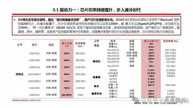 相比风冷,液冷在散热、能耗、噪音、以及维护成本方面更具优势。水的热容量是空气的4000倍,热导率是空气的25倍,在相同 流量下可以更有效降低芯片温度,同时液冷技术可以均匀覆盖芯片表面,提高系统稳定性。液冷系统只需低风扇速度即可维持散热, 因此在运行过程中噪音可比风冷降低60%以上。除此之外,不包含易磨损部件使液冷系统使用寿命更长。 液冷将代替风冷成为最优选择。风冷散热的单机柜功率在0-30kw,液冷散热的单机柜功率为30-200kw,其中冷板为30-80kw, 浸没为80-200kw。2024年GTC大会上英伟达发布了NVL72机柜,功率达到120kw,随着单机柜功率的持续上升趋势,风冷已逐渐 无法满足散热要求,液冷散热将成为主流趋势。