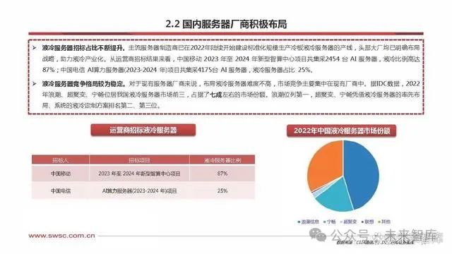 液冷服务器招标占比不断提升。主流服务器制造商已在2022年陆续开始建设标准化规模生产冷板液冷服务器的产线,头部大厂均已明确布局 战略,助力液冷产业化。从运营商招标结果来看,中国移动 2023 年至 2024 年新型智算中心项目共集采2454 台 AI 服务器,液冷比例高达 87%;中国电信 AI算力服务器(2023-2024 年)项目共集采4175台 AI 服务器,液冷服务器占比 25%。 液冷服务器竞争格局较为稳定。对于现有服务器厂商来说,布局液冷服务器难度不高,市场竞争主要集中在现有厂商中。据IDC数据,2022 年浪潮、超聚变、宁畅位居我国液冷服务器市场前三,占据了七成左右的市场份额。浪潮位列第一,超聚变、宁畅凭借液冷服务器的率先布 局、系统的液冷定制方案排名第二、第三位。