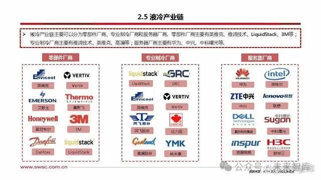 液冷产业链主要可以分为零部件厂商、专业制冷厂商和服务器厂商。零部件厂商主要有英维克、维谛技术、LiquidStack、3M等; 专业制冷厂商主要有维谛技术、英维克、高澜等;服务器厂商主要有华为、中兴、中科曙光等。