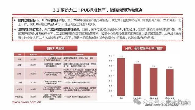 国内双碳目标下,PUE标准趋于严格。由于2020年国家宣布的双碳目标,政府对于数据中心的PUE考核趋向严格。2021年起,北、 上、广、深PUE标准已降至1.4以下,部分地区已降至1.2以下。 温控耗能亟待解决,采用液冷有望减低整体能耗。目前,国内传统风冷数据中心PUE约为1.5,温控系统能耗占总能耗约40%,在 国家严格的PUE考核标准下,风冷系统已无法满足国家政策需求,数据中心急需降低温控系统能耗以满足国家政策。从PUE指标来 看,液冷技术可以将PUE指标降至1.2以下,满足当前国家政策对绿色数据中心的要求,达到减低耗能的目标。