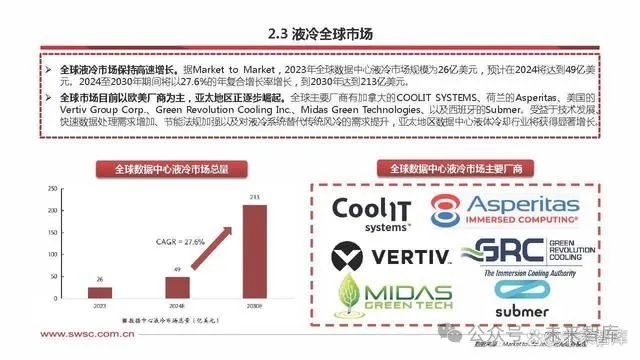 全球液冷市场保持高速增长。据Market to Market,2023年全球数据中心液冷市场规模为26亿美元,预计在2024将达到49亿美 元。2024至2030年期间将以27.6%的年复合增长率增长,到2030年达到213亿美元 。 全球市场目前以欧美厂商为主,亚太地区正逐步崛起。全球主要厂商有加拿大的COOLIT SYSTEMS、荷兰的Asperitas、美国的 Vertiv Group Corp.、Green Revolution Cooling Inc.、Midas Green Technologies、以及西班牙的Submer。受益于技术发展、 快速数据处理需求增加、节能法规加强以及对液冷系统替代传统风冷的需求提升,亚太地区数据中心液体冷却行业将获得显著增长。