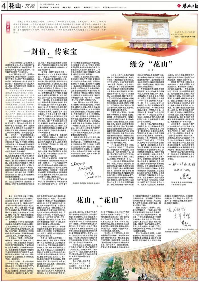 花山,广西一张世界级的文化名片。“花山”,广西主流媒体一个文化传播阵地。据史料记载,1938年11月,诗人艾青抵达桂林,主持《广西日报》副刊,在桂林,艾青写下了广为人知的诗歌《我爱这土地》。所办副刊在当时社会产生巨大影响,团结了一大批著名文化人士,发表了一大批救亡图存的作品,对于正处在艰难抗日战争中的民众,起到鼓舞、激励的作用。如今的“花山”,与世界文化遗产同名,可以说是机缘,也是慧眼。