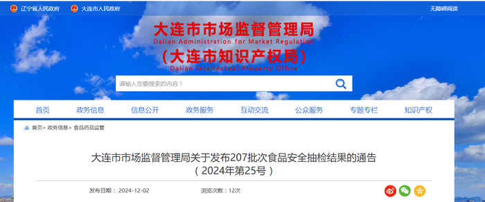 辽宁省大连市市场监督管理局关于发布207批次食品安全抽检结果的通告(2024年第25号)