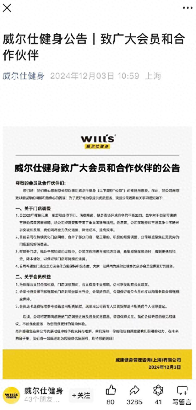 威尔仕健身发布公告回应多家门店停业:持续优化门店网络
