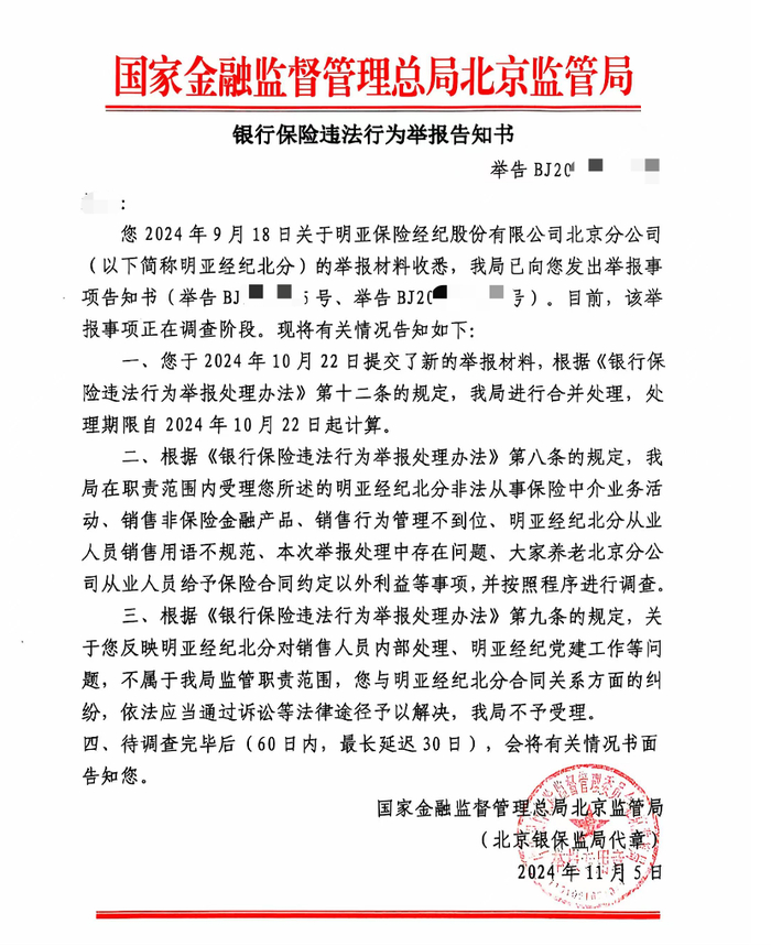刘蕊提供的一份国家金融监督管理总局北京监管局的《银行保险违法行为举报告知书》显示,该局将受理其所述的明亚经纪北分非法从事保险中介业务活动、销售非保险金融产品等事项,并按照相关程序进行调查。该调查将在60日内(最长延迟30日)完毕,这也意味着12月中旬或将有初步调查结果。