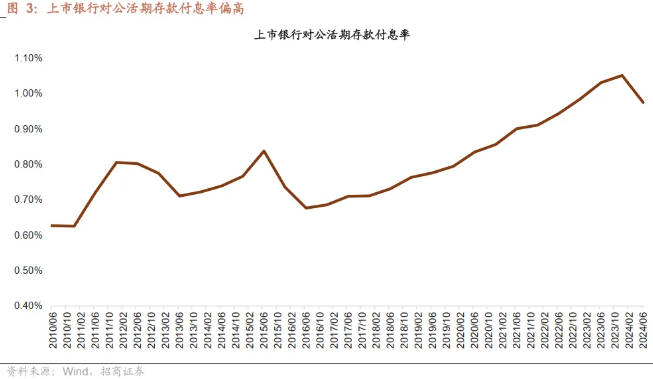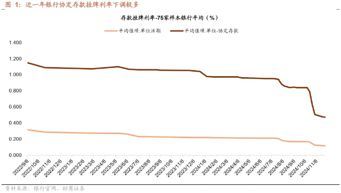 招商证券研报指出,引入“利率调整兜底条款”预计影响最大为对公协定存款利率。对公协定存款为类活期存款,其期限偏短,占比较高,且前期挂牌利率偏高,因此在存款利率下行周期中,涉及存款服务协议的部分难以快速调整。今年以来协定存款挂牌利率下调较多,国有行对公协定存款平均下调幅度达54bp,预计引入“利率调整兜底条款”后,对公协定存款利率和对公活期存款成本率将会有明显下降。
