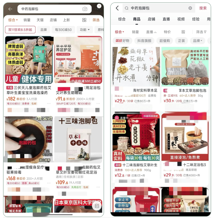 上海市消保委通过网购平台搜索发现,网上售卖的这些中药植物泡脚包的“配方”非常多,除了常见的驱寒助眠外,甚至还有宣传能排毒补肾。