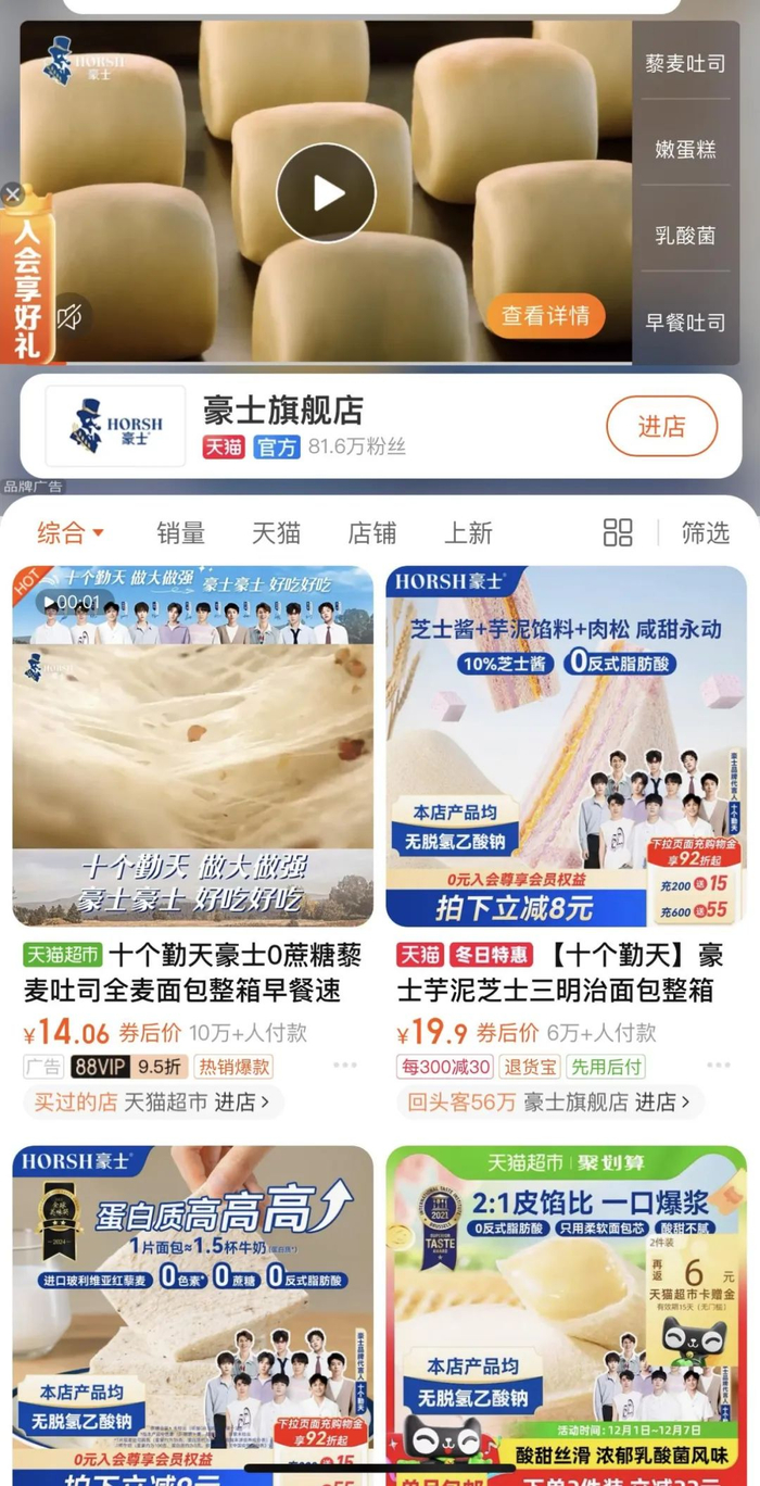 第三方数据显示,豪士面包仅在抖音电商渠道,年内销售额就已达1.65亿元,在天猫、京东等渠道,多款面包销量也都超过50万单。
