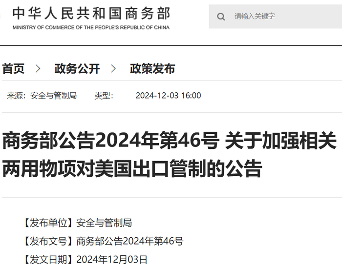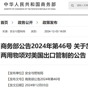 今日,商务部公告称,根据《中华人民共和国出口管制法》等法律法规有关规定,为维护国家安全和利益、履行防扩散等国际义务,决定加强相关两用物项对美国出口管制。现将有关事项公告如下: