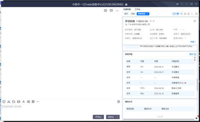 QTrade是腾讯旗下领先的金融科技与监管科技公司,专注于用科技手段为固收市场提供集即时通讯工具、合规管理、一级发行与招投标、二级交易、数据服务、系统接口服务于一体的智能解决方案。在这里,交易员们可以通过聊天窗口债券速览和平台债券详情页面查看相关主体3C评级结果。