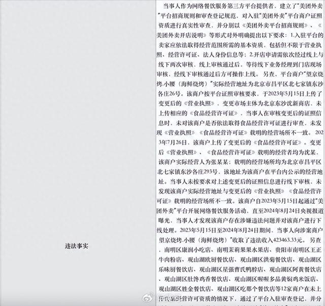 平台商户“望京烧烤.小腰(海鲜烧烤)”在变更市场主体和经营地址后,未依法上传更新后的《食品经营许可证》,且实际经营地址与证照信息不一致。但美团外卖平台在审核时未能发现这些问题,导致该商户在长达一年多的时间里,在未完全合规的情况下通过平台开展网络餐饮服务活动,并产生了 42.35 万元的违法收入。