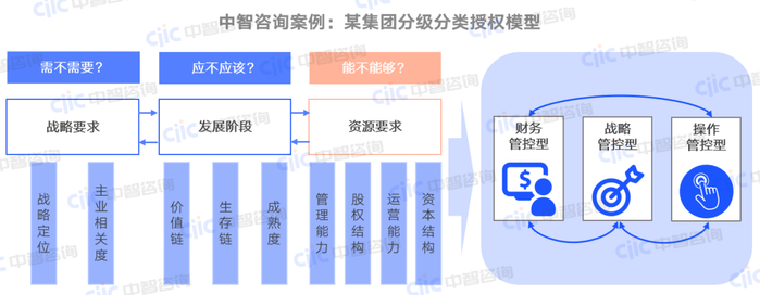 从实践来看,中智咨询建议综合性产业集团充分考虑业务板块多元、子企业数量多、股权比例多样、成立时间长短不一、管理成熟度不均衡等特点,从战略要求、发展阶段和资源要求等三个方面,探索建立分级分类授权模型。