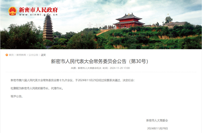 杜鹏懿任新密市副市长、代理市长